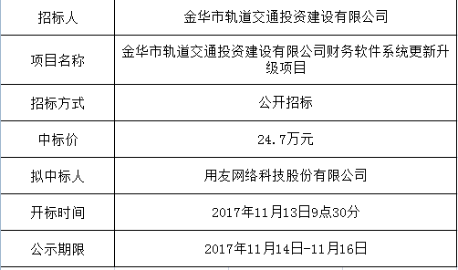 金華市軌道交通投資建設(shè)有限公司財務(wù)軟件系統(tǒng)更新升級項目中標公示