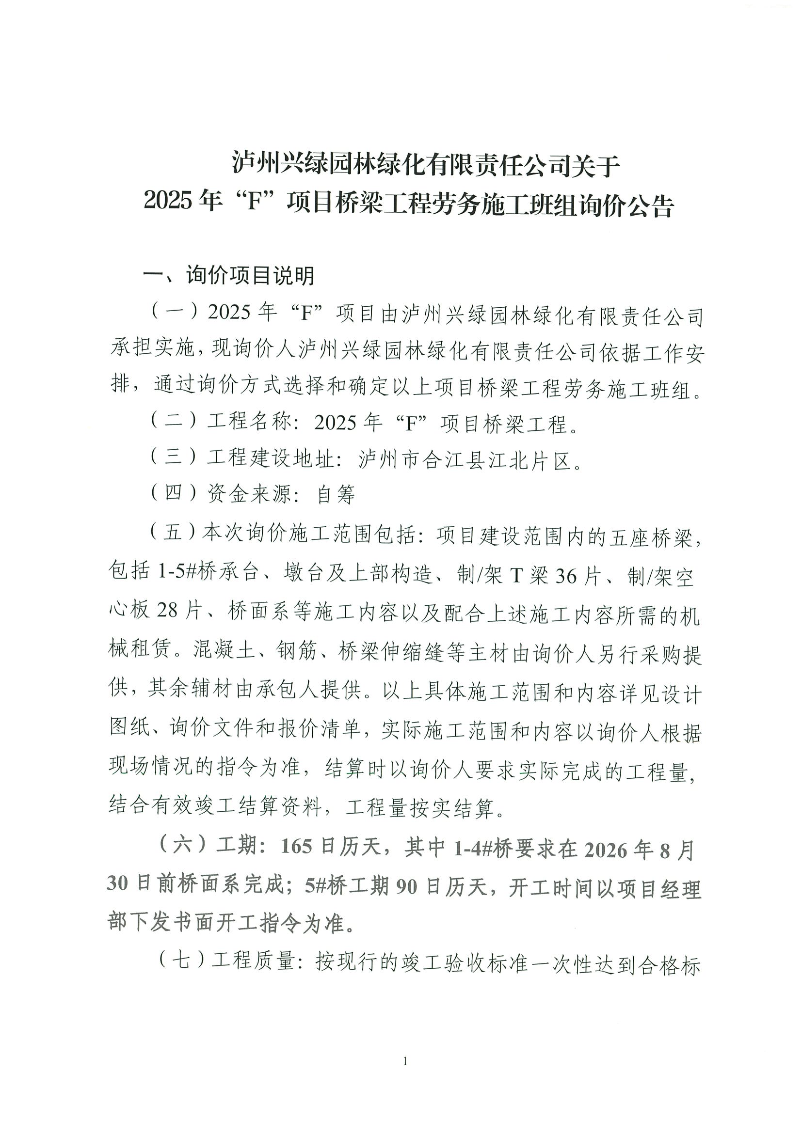 瀘州興綠園林綠化有限責(zé)任公司關(guān)于 2025年“F”項(xiàng)目橋梁工程勞務(wù)施工班組詢價公告